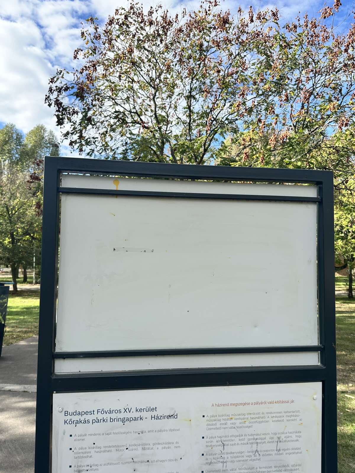- Kőrakás park pumpapálya rongált házirendtábla csere